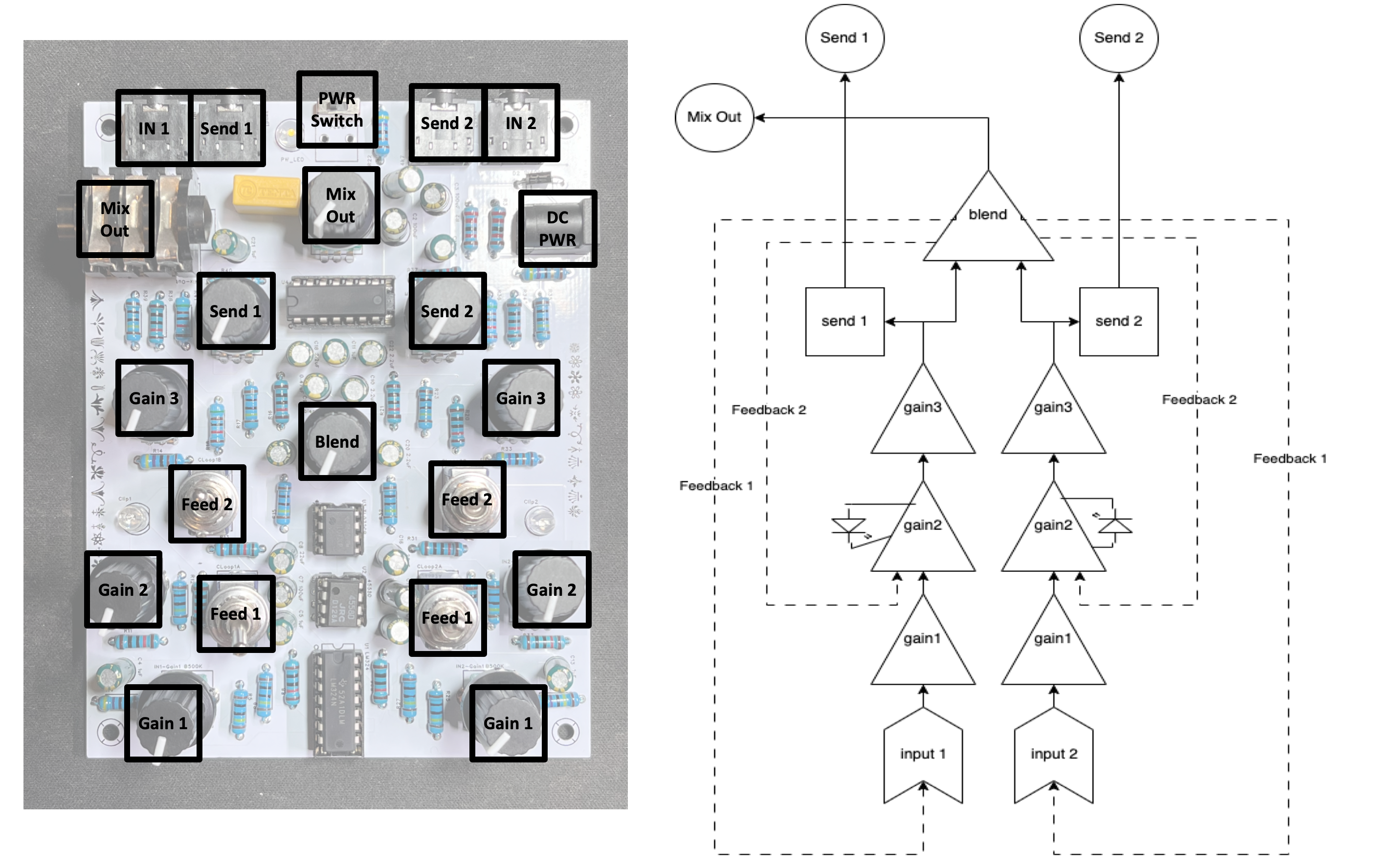 The Input1 and Input2 is floating if nothing connected. Each channel has 3 stages of gain through 3 different opamps, LM324 (Raw and powerful, most gain range), 4558D (Musical, with clipping diode), TL072 (Thinner, sometimes good for more high frequency). These channels meet at the blend control and go to the Master Out. In additional, each channel has a dedicated send out: send1 + send2. The feedback1 usually can create pulses, while feedback2 has more impact in the sonic texture.